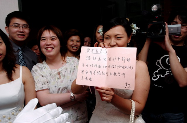 喝完甜茶稍事休息之後,精彩的大考驗馬上開始。其實我對我老公可好的,不會出刁鑽的題目為難他啦,只是這麼輕輕鬆鬆就讓他把我帶走,嘿嘿,這也太說不過去了。還好我們家老爺最疼我了(趕快拍一下馬屁),有些大男人一點的新郎,聽說還威脅新娘如果有為難就不娶了^^|||,這個……ㄟ……