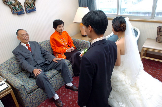 說到這個湯圓,本來我們是想用甜湯代替,因為不在家中一切從簡,不過呢,我那夠意思的死黨新祕,在前一天晚上討論造型跟婚禮流程時,得知我沒有湯圓這件事,非常夠義氣的在很晚回家時還殺去幫我買湯圓,然後一大早起床煮好送來給我,再陪著我「嫁」過去之後,由男方倒到碗裡,順利完成這項禮俗,套一句我媽說的,「好朋友不用多,像這種的一個就夠了」(不過我好朋友還是好幾個啦,呵),總之,湯圓小插曲證明了近廿年的友誼不是假的,當然也讓我銘感於心。