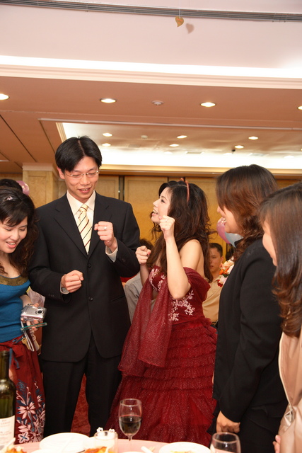 由於歸寧只有兩套禮服,所以在幾道菜之後,便展開我們的敬酒過程。首先當然是從家族親戚、爸媽多年老友開始,逐漸到我的同學朋友桌時,我就知道,今天絕對不會像結婚那麼簡單就過去了。