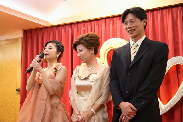 發完了小熊,等大家都回座之後,由新娘子我開始接過主持人的麥克風,為大家演唱一曲……呃,沒有啦,是我想對所有的賓客說聲感謝,並且,要特別謝謝我偉大的媽媽,媽媽也在主持人的邀請下到台上來。