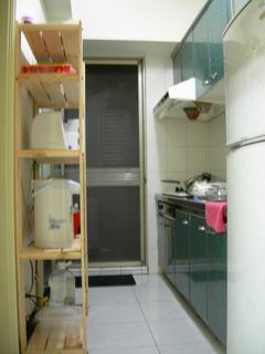 廚房的流理台和冰箱是房東的,仍然是很醜的綠色(這個我只好忍耐了),後面的木架是買的,用來放小家電和雜糧,方便使用。