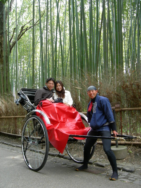 渡月橋頭有不少人力車招攬生意,其實坐這個我心裡很是不安,不過這位糸井桑態度好好喔,又用中文跟我們聊北平烤鴨,又說他想來台灣,而且中途會隨時停下讓我們拍照,互相遇到同行也會親切打招呼,然後到目的地時還讓我們填顧客意見調查表,哈哈。真的覺得他們很以自己的職業為榮,服務又周到,所以我也就開開心心接受囉!