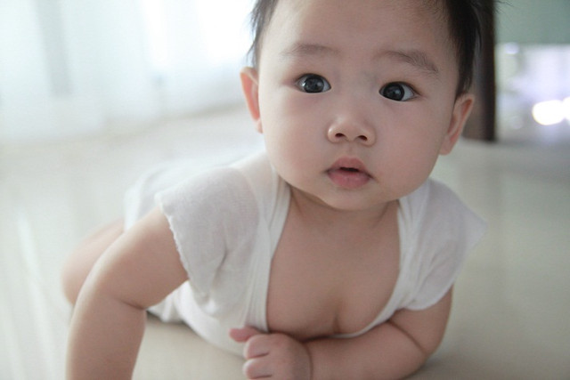 開始爬得很好的六月。其實呈這時已經滿九個月了,他算很晚才會爬的寶寶。不過這張照片的重點是事業線,哈哈。