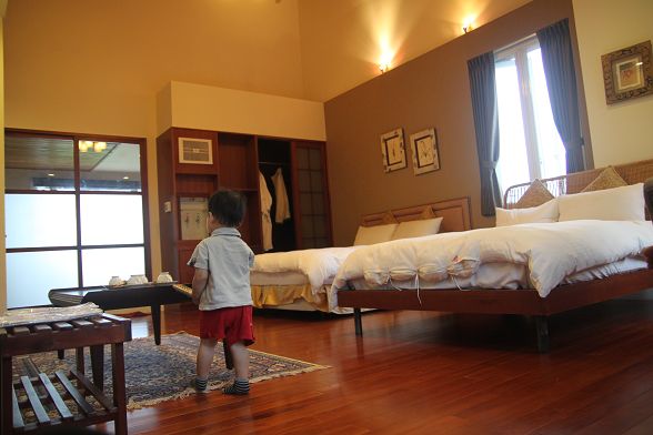 兩張雙人大床,木地板,挑高的空間。很寬敞,也很乾淨,還蠻舒服的。玻璃門拉開是很~大的浴室,有個愛心浴缸(呈一整個玩水玩到不亦樂乎)。