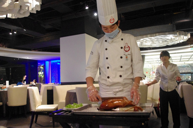 好像忘了拍餐廳環境?大董烤鴨非常現代時尚,跟全聚德的傳統風格完全不同,最炫的是餐廳正中間就是烤鴨爐,完全是開放式的,廚師料理烤鴨跟在舞台上表演一樣,還可以照相耶!好可惜我們好像因為趕時間沒照到。